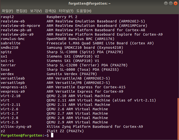 위 명령어를 입력하여 QEMU가 어떤 ARM 시스템을 에뮬레이트할 수 있는지 확인했습니다.
