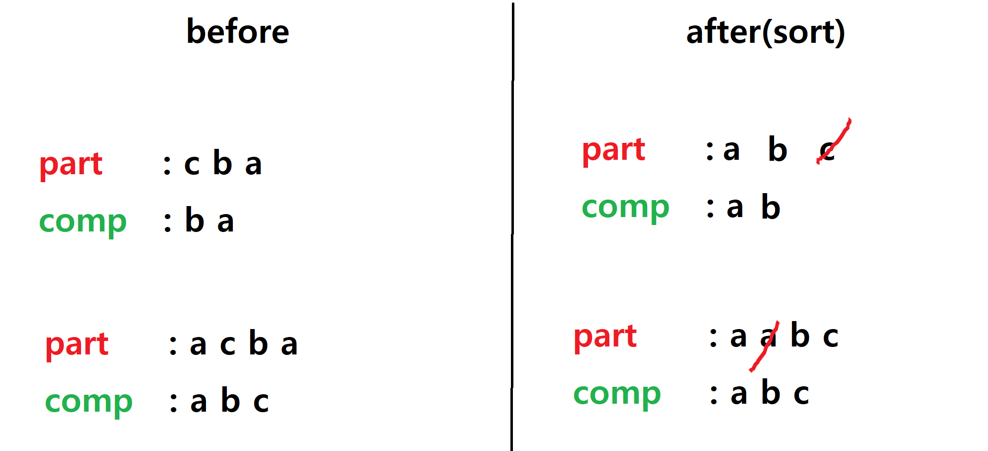 명단들을 같은 기준으로 정렬하고 각 원소들을 비교한다.