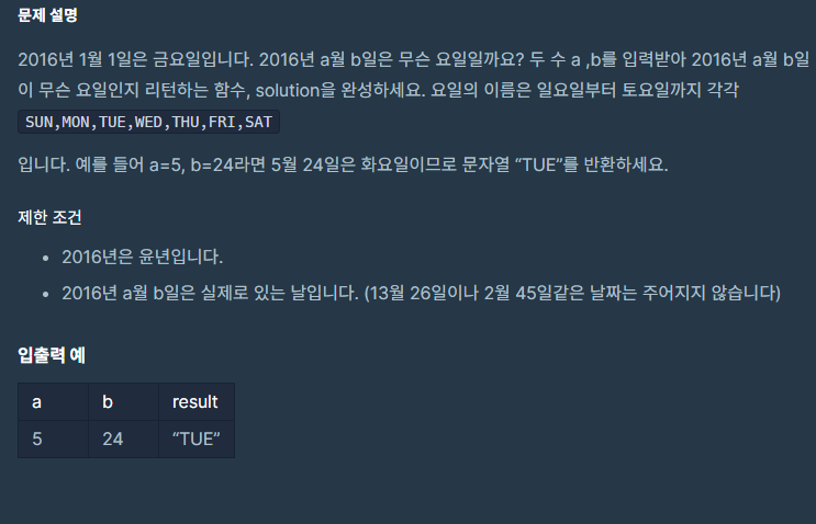 날이 얼마나 지났는지 계산을 하여 나머지 연산을 이용해 몇요일이 지났는지 구한다.