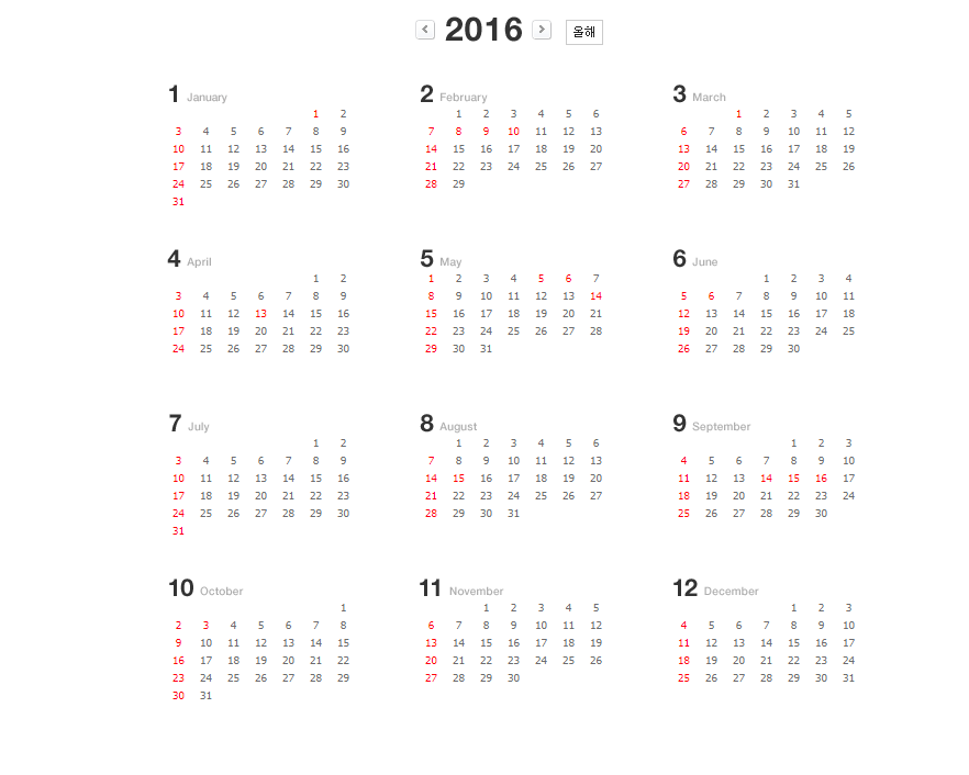 네이버 캘린더 앱에 들어가서 2016년 각 월의 일이 얼마나 있는지 파악한다.