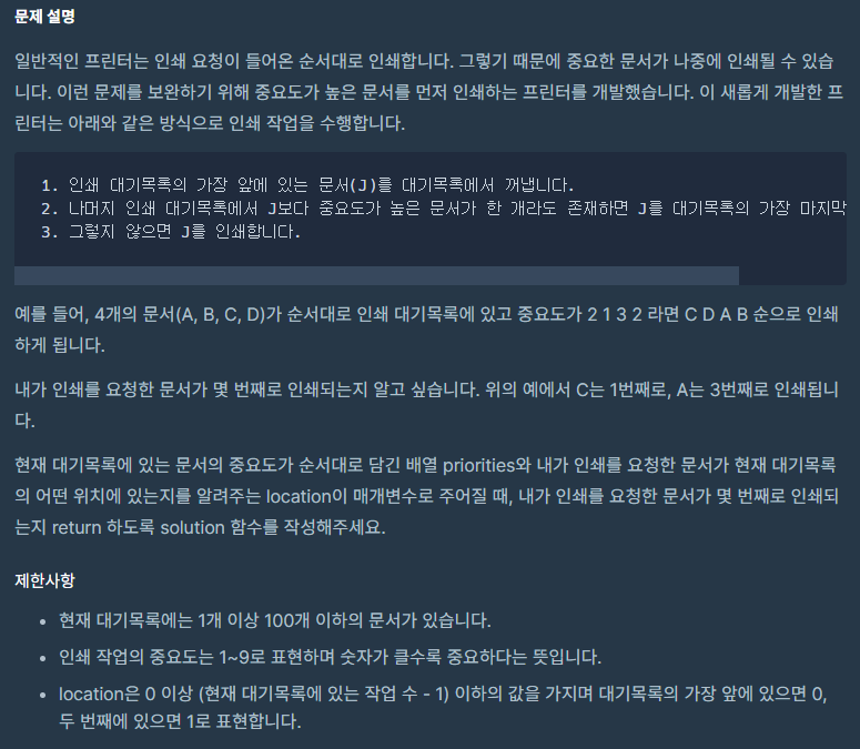 문서를 중요도 순에 따라서 정렬한 후, 자신의 문서가 몇 번째에 인쇄되는지 알아내는 문제이다.