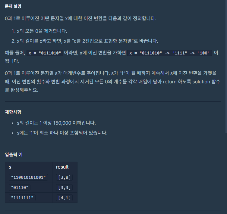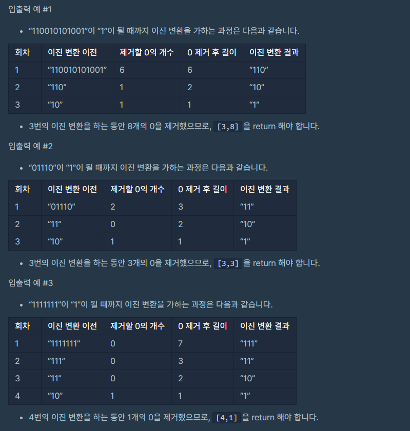 입력으로 준 문자열이 '1'이 될 때까지 커스텀으로 정의된 이진변환 행위를 반복하는 프로그램을 만들면된다.