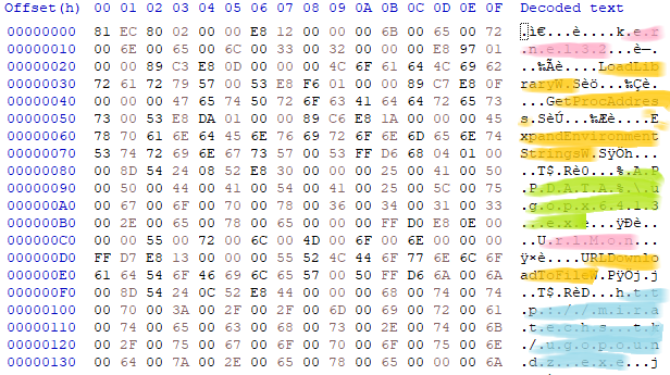 복호화된 데이터를 살펴봤을 때, 2단계 쉘코드에서 어떤 행위를 할지 추측할 수 있는 정보들이 존재한다.