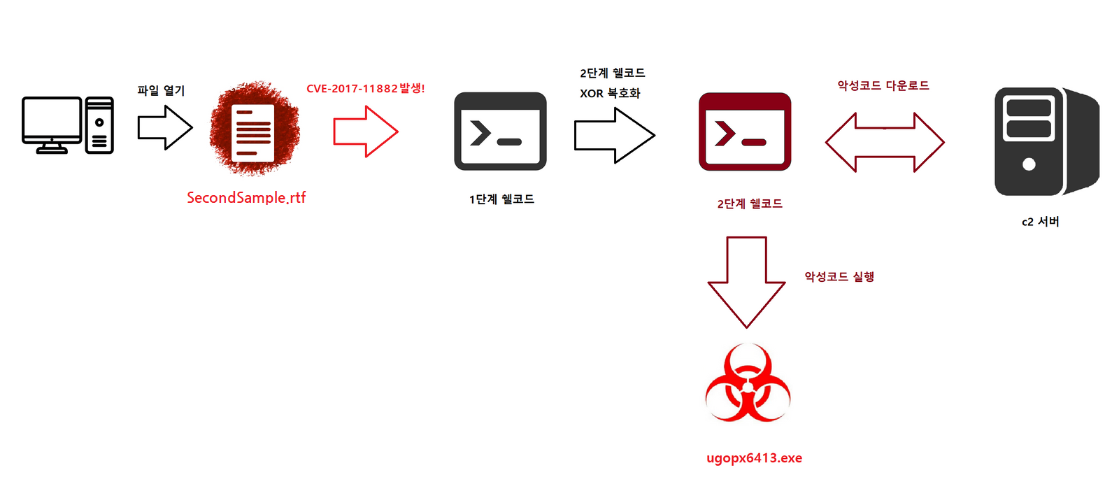 해당 샘플은 CVE-2017-11882를 사용하여 쉘코드를 실행시켜 파일을 다운로드하고 실행하는 분명한 악성코드이다.