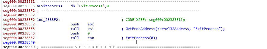 마지막으로 ExitProcess 함수의 주소를 구하고 호출하여 프로그램을 종료시킨다.