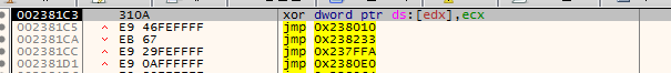 6. edx 레지스터가 가르키는 주소의 값과 ecx 레지스터의 값을 XOR 연산한 후, 주소에 결과를 저장한다.