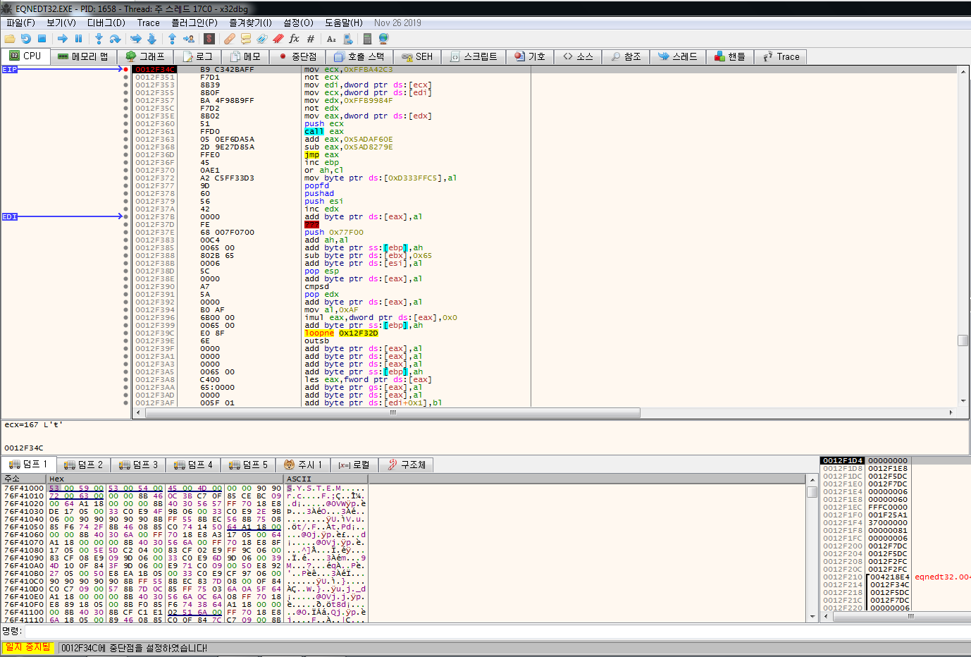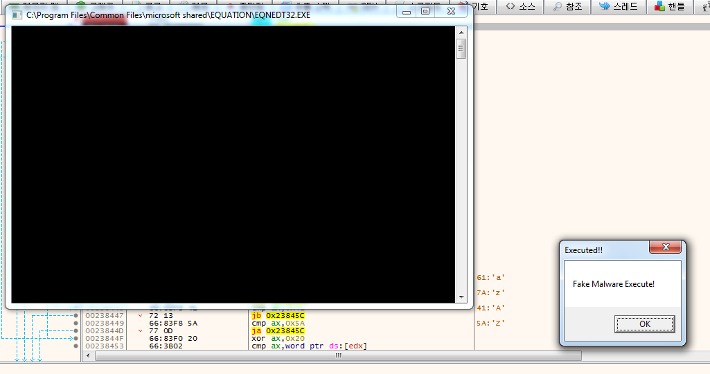 문서를 열었고, 수식 프로그램이 실행됐을 때 디버거에 붙여주는 것을 성공했다.