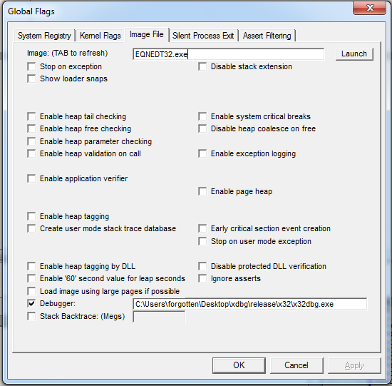 Image File 탭에서 EQNEDT32.exe라는 이름으로 프로세스가 실행되면 해당 경로의 디버거가 실행될 수 있도록