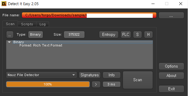 Detect It Easy로 Sample.vir 파일을 확인해본 결과, 해당 파일은 Rich Text Format, RTF 문서이다.