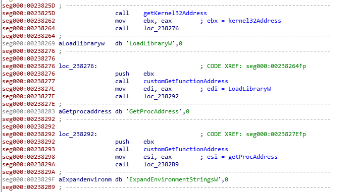 Kernel32 모듈이 로드된 메모리 주소를 얻어오고 LoadLibraryW, GetProcAddress 함수의 주소를 얻어오는 코드다.