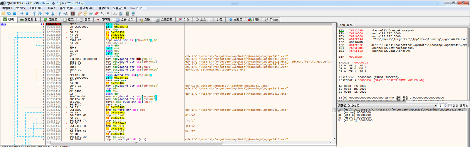 CreateProcessW 함수의 주소를 구하고 호출하여 다운로드 받은 악성코드를 실행한다.